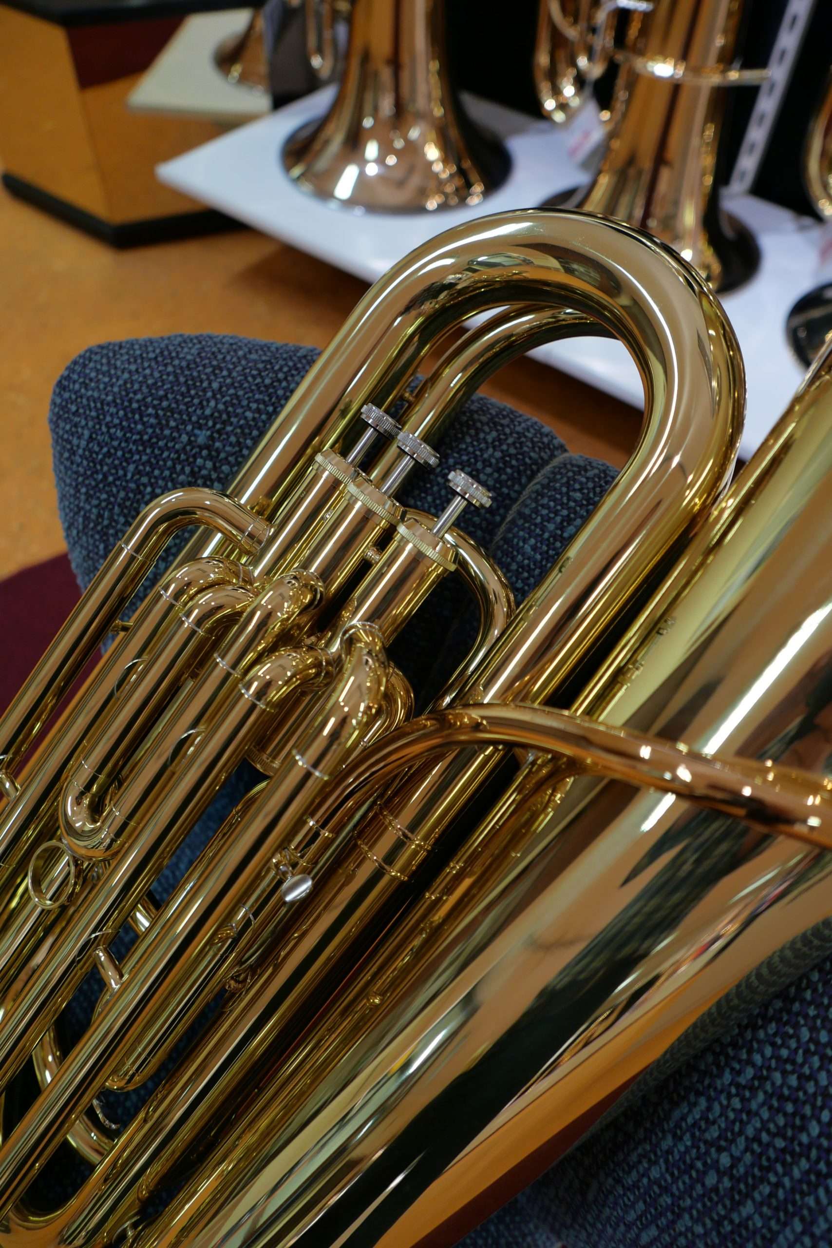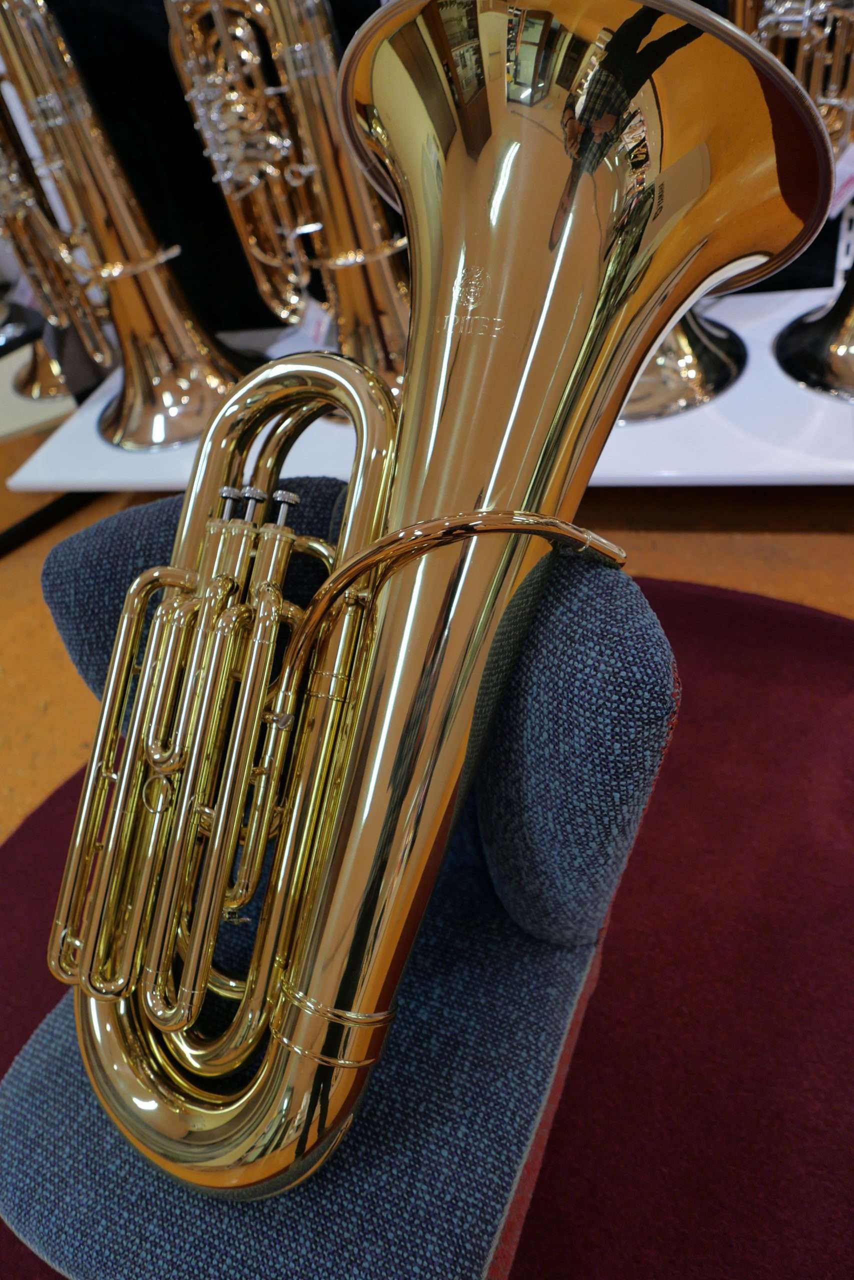 Bohrung 16.80 mm, Schallbecher 36,55 cm, Mundrohr Goldmessing, Gewicht 6,6 kg, Höhe 84 cm, Messingkorpus, Edelstahlventile, Mundstück und Jupiter Formetui mit Rollen.