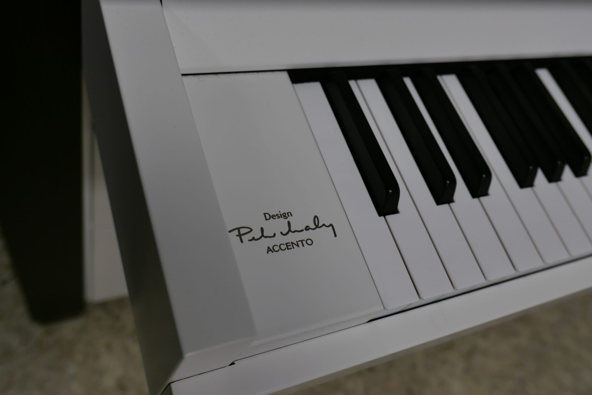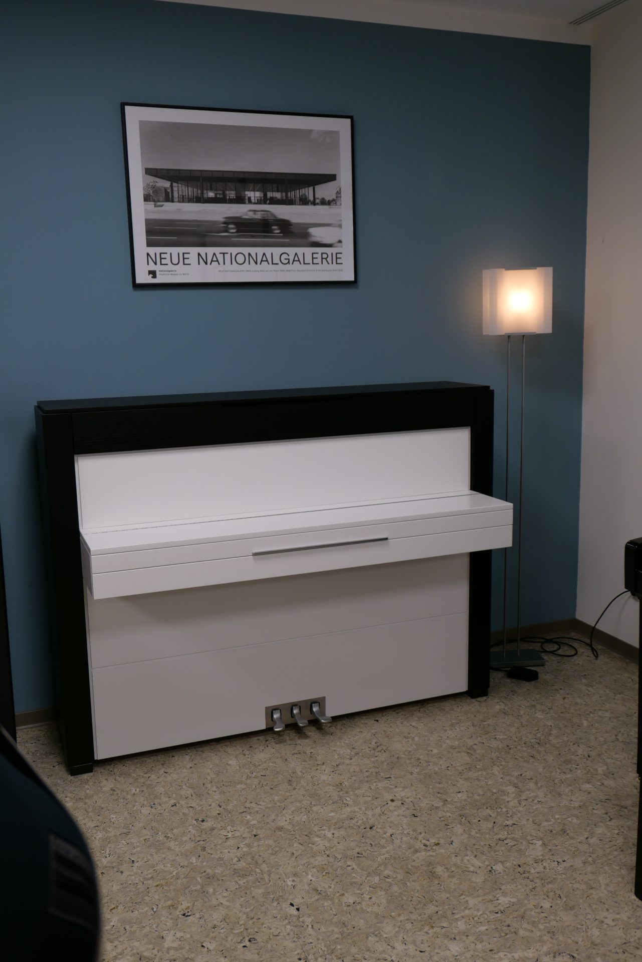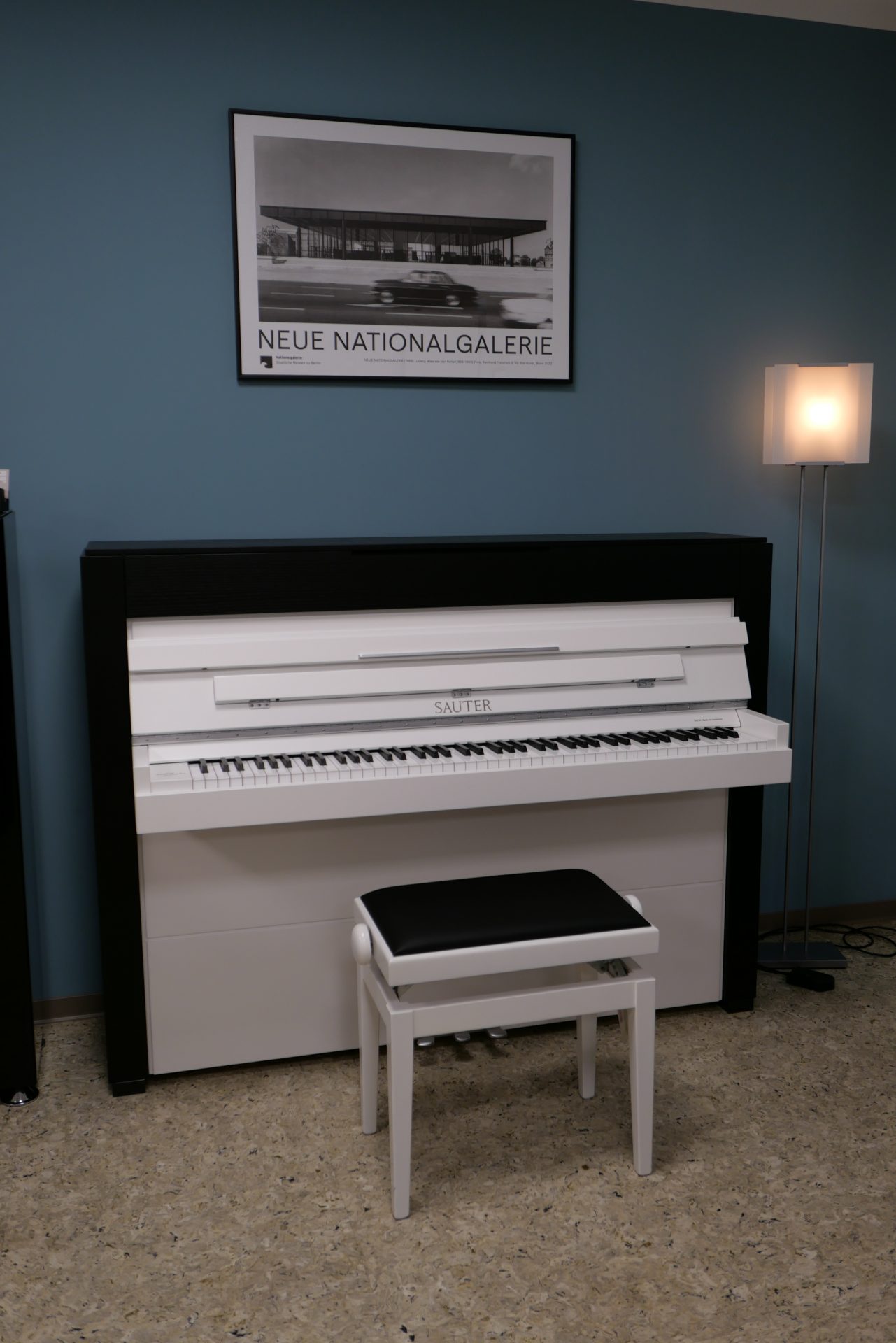Peter Maly Design Klassiker, ACCENTO mit kontrastreicher Oberfläche, RENNER Mechanik mit R2 Sauter Technik. Das Sauter ACCENTO 119 Design-Modell von Peter Maly und wurde 2016 anlässlich der 20jährigen Zusammenarbeit des Designers mit Sauter entwickelt. Die weiß matte Front mit schwarz gebeiztem Eschen-Rahmen gibt einen tollen Effekt. Der Ober-u. Unterrahmen sind etwas zurückgesetzt, wodurch die Form an Tiefe gewinnt. In diesem Versatz wurde der Spieltisch eingepasst. Das Ergebnis: Ein interessanter räumlicher Effekt, der dieses Instrument zu einem echten Designmodell macht, welches auch noch in Jahrzehnten Gültigkeit hat – wie bei allen Sauter-Maly Modellen. Feinste Materialien, beste Verarbeitung, gefertigt 100% in Deutschland mit Zuliefer-Materialien ebenfalls ausschließlich aus Deutschland. Die Manufaktur-Philosophie gibt bei SAUTER den Ton an. Noch heute werden die Dinge, die einem Piano seine Seele verleihen, von Hand gefertigt. Hier herrschen nicht Maschinen, hier sind Meisterhände am Werk. Hier schlägt die Kunst den Takt, duftet es nach Holz. Das alles kann man hören, sehen, fühlen. Ein Klavier, das alle Sinne berührt, perfektes Spielgefühl, phänomenaler Klang, herausragendes Design und Verarbeitung.